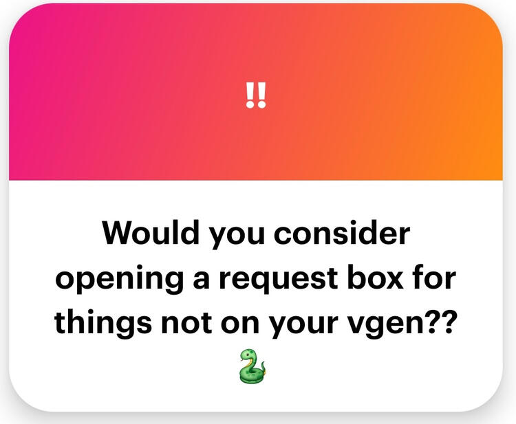 If you’re talking about request box in general, my NGL is the place for that and more ^^ but if you’re talking about the new Custom Inquiry feature on VGen, i did set that up recently thanks to you’re request!