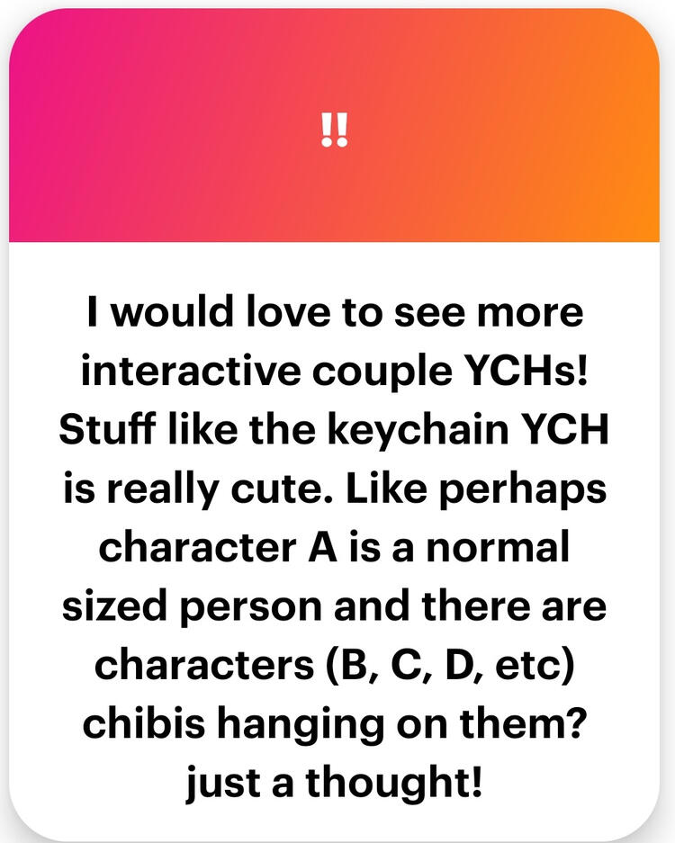 I see you cooking 👀 i couldn’t imagine it clearly BUT i do get what you’re saying and i love that!! I think i'll make it separately but with the same keychain/merch themed <3 i love that some people like the idea of the new YCH, i'm a sucker for trinkets :P